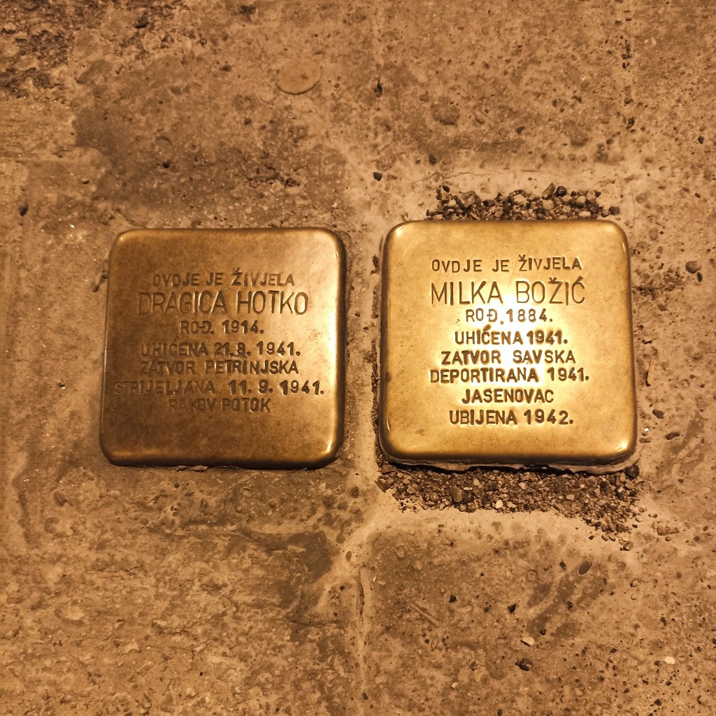 Kameni spoticanja za Dragicu Hotko i Milku Božić postavljeni su na raskrižju Slavonske avenije i Ulice Hrvatske bratske zajednice.